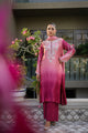 Pistachio Pink features a refined blend of green and pink tones, crafted on luxurious sheesha silk and adorned with delicate resham, stones, sequins, pearls, kora, and dabka work. The outfit is paired with motif-detailed culottes and a two-toned dupatta, enhanced with elegant motifs and a soft sequin spray, creating a graceful, festive look with a fresh pastel charm.